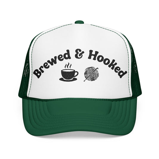 Brewed & Hooked Trucker Hat – Coffee & Yarn Crochet & Knitting Cap | Coffee Lover Craft Snapback Hat