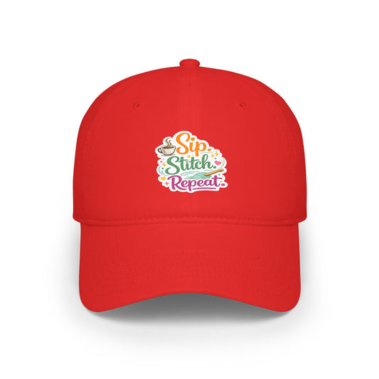 Sip. Stitch. Repeat.™ Low Profile Baseball Cap – Embroidered Crochet & Knitting Hat for Coffee Loving Crafters