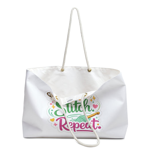 Sip Stitch Repeat Weekender Bag – Crochet Project Bag for Yarn Lovers, Knitting & Crochet Travel Tote, Craft Retreat Tote