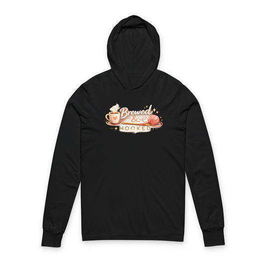 Brewed & Hooked Hooded Long Sleeve Tee — Cozy Coffee & Crochet Lightweight Hoodie Shirt for Yarn Lovers